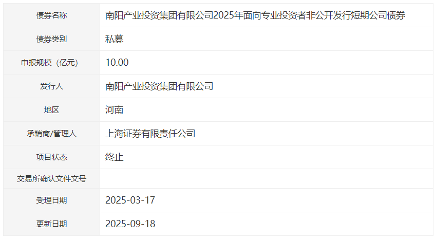 【大河财立方消息】9月18日,据深交所披露,南阳产业投资集团有限公司2025年面向专业投资者非公开发行短期公司债券的项目状态更新为“终止”,拟发行金额为10亿元,品种为私募,受理日期为2025年3月17日。