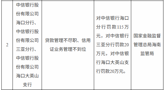因贷款管理不尽职、信用证业务管理不到位,中信银行海口分行被罚款115万元,中信银行三亚分行被罚款20万元,中信银行海口大英山支行罚款被20万元。