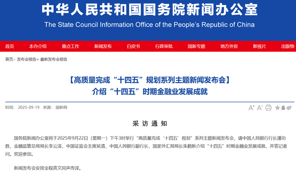 国务院新闻办公室将于2025年9月22日(星期一)下午3时举行“高质量完成‘十四五’规划”系列主题新闻发布会,请中国人民银行行长潘功胜,金融监管总局局长李云泽,中国证监会主席吴清,中国人民银行副行长、国家外汇局局长朱鹤新介绍“十四五”时期金融业发展成就,并答记者问。