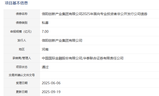 【大河财立方消息】9月22日消息,信阳创新产业集团有限公司2025年面向专业投资者非公开发行公司债券项目获深交所通过。债券发行规模7亿元,承销商/管理人为中金公司、华泰联合证券。2025年7月24日,经中证鹏元综合评定,发行人主体信用评级为AA+。