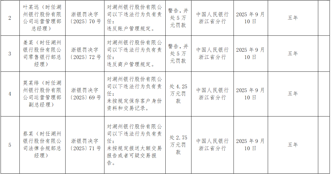 时任湖州银行法律合规部总经理蔡某对未按规定报送大额交易报告或者可疑交易报告负有责任,被罚款2.75万元。