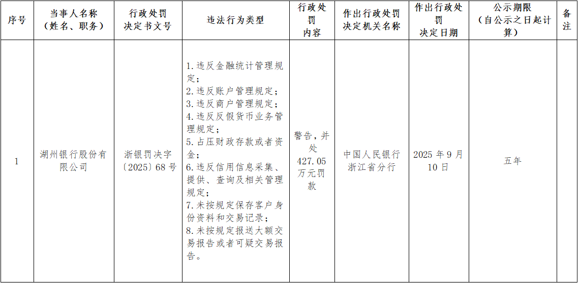 【大河财立方消息】9月22日消息,中国人民银行浙江省分行披露的行政处罚决定信息显示,因多项违法行为,湖州银行被警告,并处427.05万元罚款。