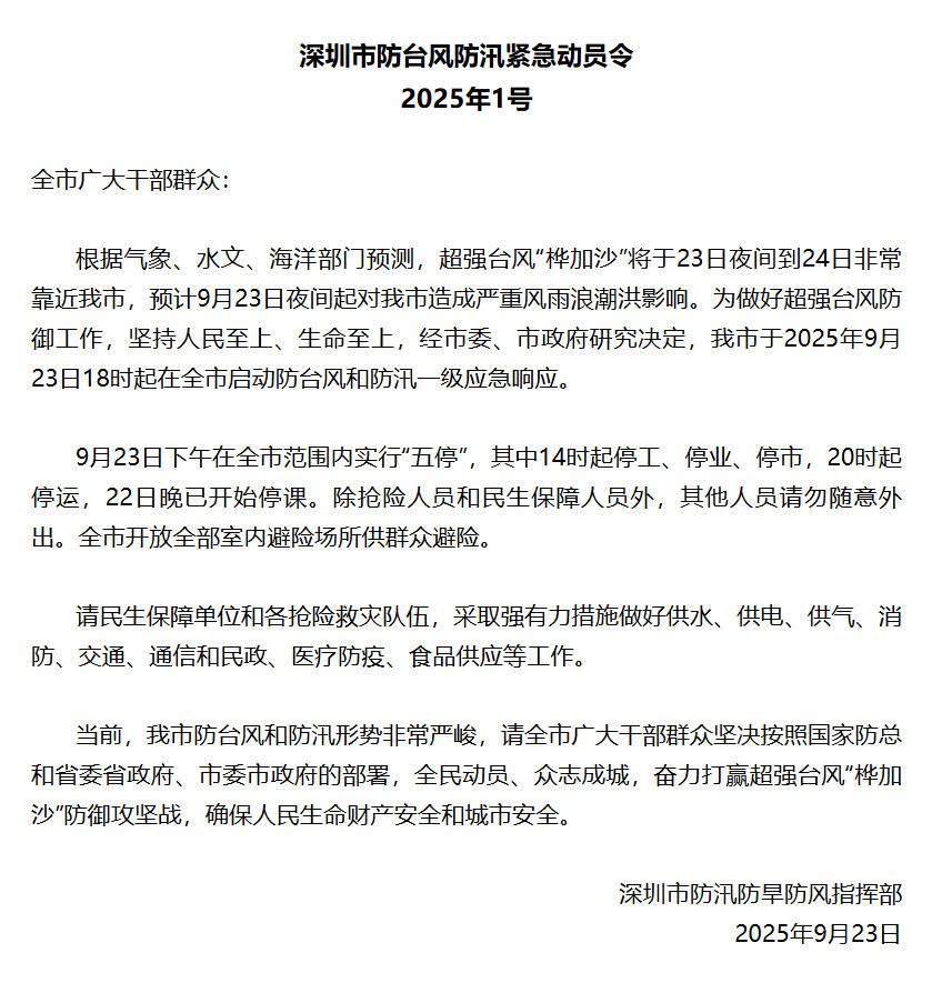 中新网9月23日电 据“深圳发布”微信公众号消息,9月23日,深圳市防汛防旱防风指挥部发布深圳市防台风防汛紧急动员令(2025年1号)。具体如下:
