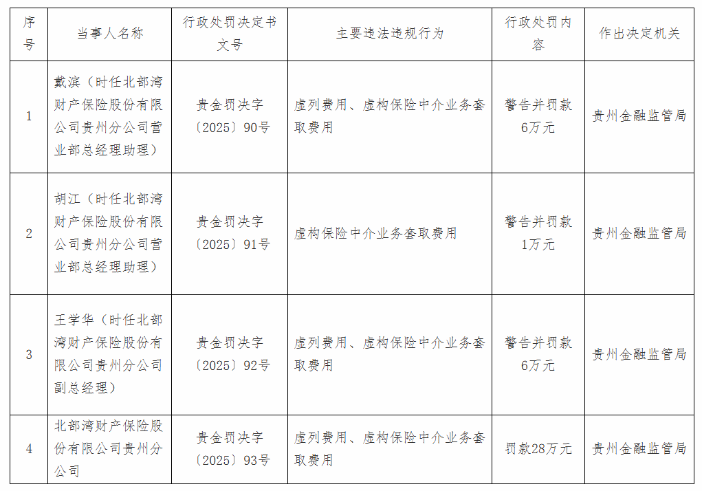 因虚列费用、虚构保险中介业务套取费用,北部湾保险贵州分公司被罚款28万元,时任该公司总经理助理戴滨被警告并被罚款6万;时任该公司总经理助理胡江被警告并被罚款1万;时任该公司副总经理王学华被警告并罚款6万元。