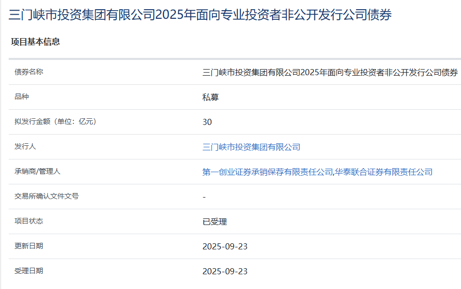 【大河财立方消息】9月23日消息,三门峡市投资集团有限公司2025年面向专业投资者非公开发行公司债券项目获上交所受理。