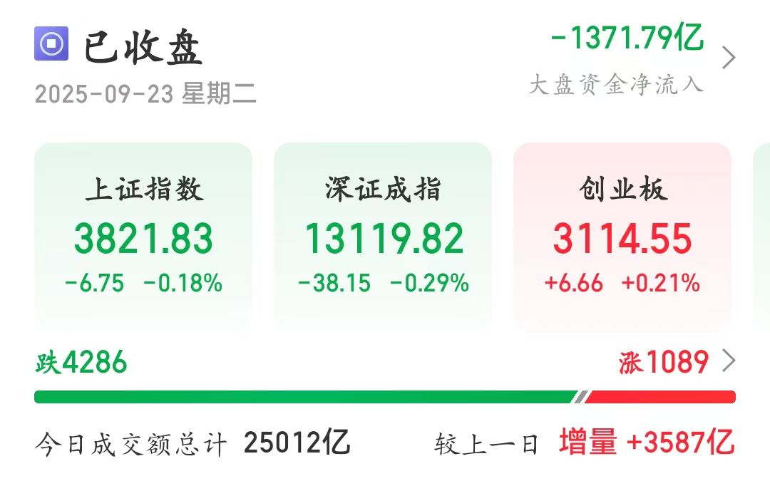 京沪深三市1089只个股上涨,4286只下跌。全市场成交额25012亿元,较前一交易日放量3587亿元。