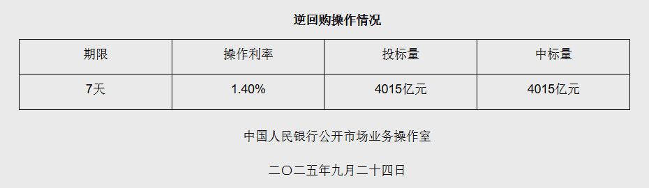 中新网9月24日电 据央行网站消息,2025年9月24日中国人民银行以固定利率、数量招标方式开展了4015亿元7天期逆回购操作。具体情况如下: