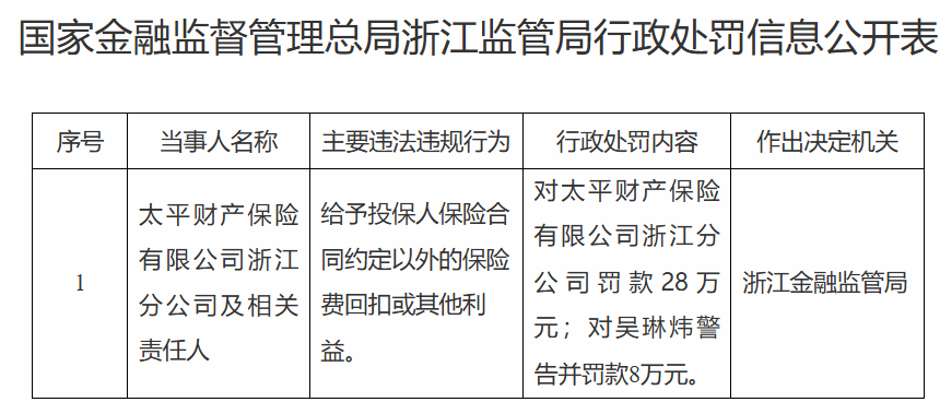 【大河财立方消息】9月25日,国家金融监督管理总局浙江监管局披露的行政处罚信息公开表显示,因给予投保人保险合同约定以外的保险费回扣或其他利益,太平财产保险有限公司浙江分公司被罚28万元。