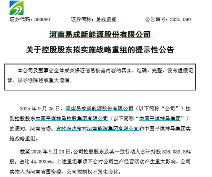 易成新能表示,截至2025年9月20日,公司控股股东及其一致行动人合计持股8.26亿股,占比44.0935%。上述重组事项不会对公司生产经营活动产生重大影响。
