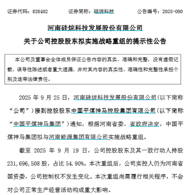 硅烷科技公告称,截至2025年9月19日,公司控股股东中国平煤神马集团及其一致行动人持股2.32亿股,占比54.90%。本次重组不会对公司正常生产经营活动构成重大影响。