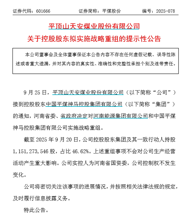 平煤股份公告称,截至2025年9月20日,控股股东中国平煤神马集团及其一致行动人持股11.51亿股,占比46.62%。上述重组事项不会对公司生产经营活动产生重大影响。