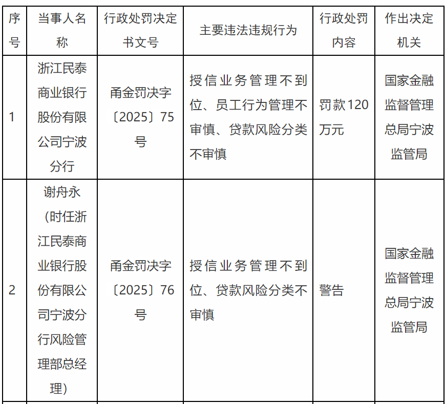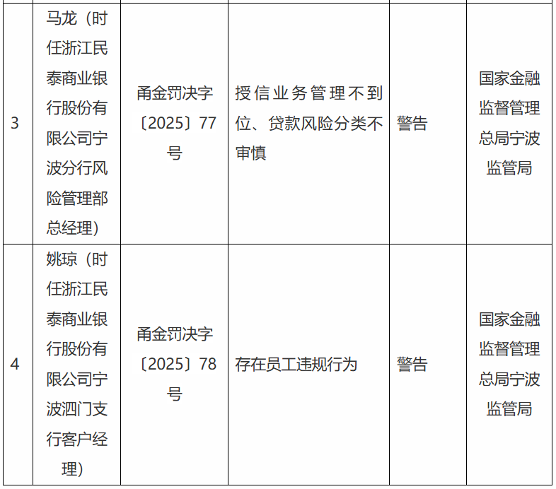 同时,国家金融监督管理总局宁波监管局对时任浙江民泰商业银行宁波分行风险管理部总经理谢舟永、时任浙江民泰商业银行宁波分行风险管理部总经理马龙、时任浙江民泰商业银行宁波泗门支行客户经理姚琼警告。