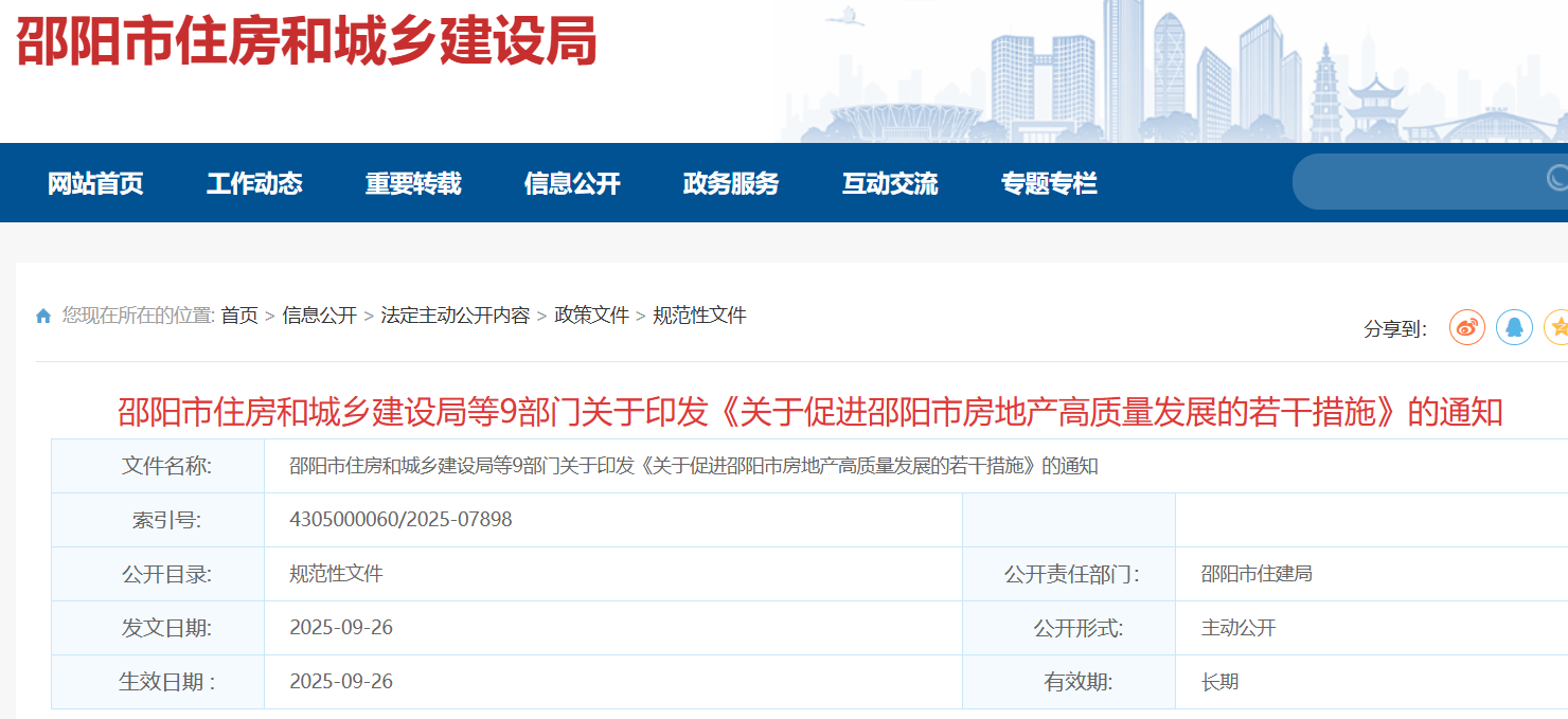 【大河财立方消息】9月27日消息,邵阳市住房和城乡建设局等9部门发布通知,印发《关于促进邵阳市房地产高质量发展的若干措施》,从需求端、供给端、制度端三端发力,在供应、金融支持、交易便利、品质提升等方面出台15条措施。