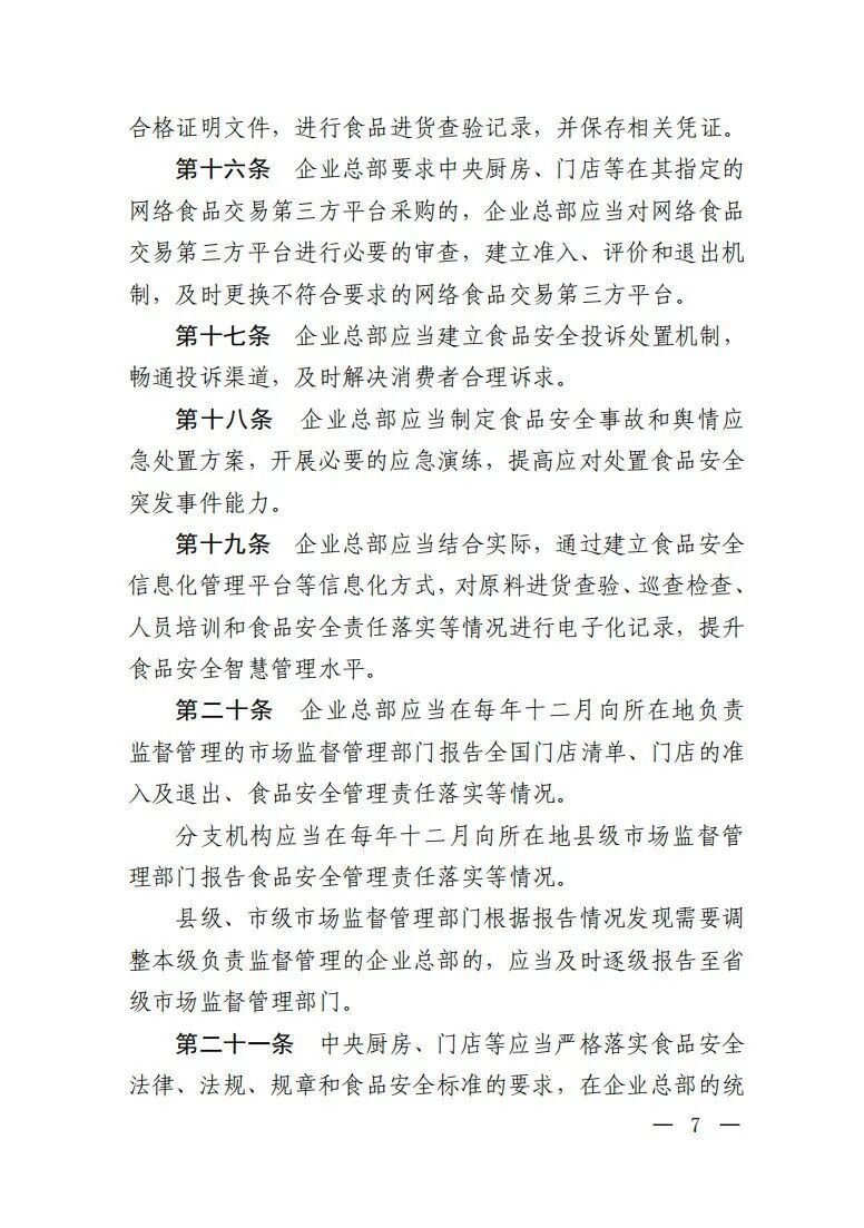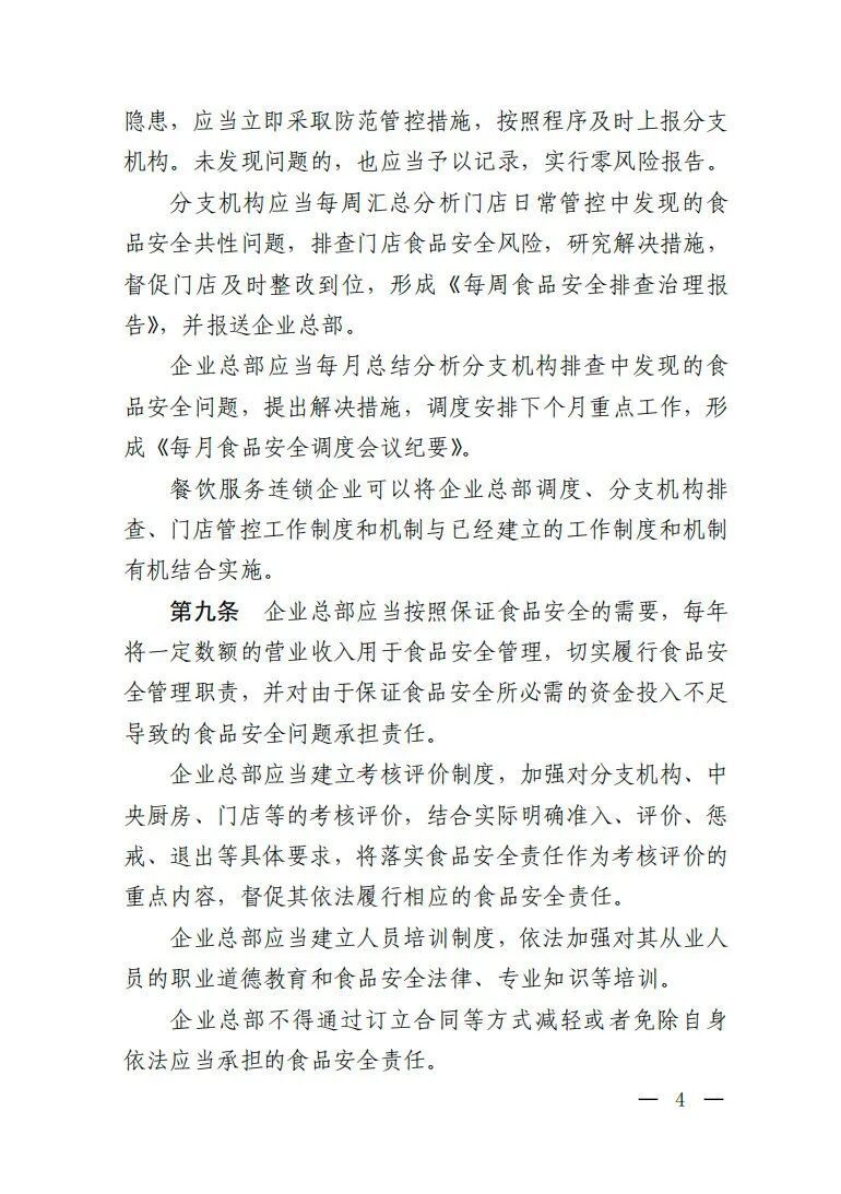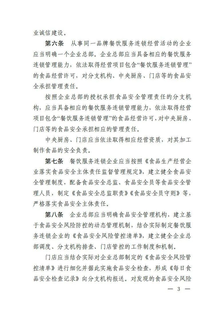 在监管机制方面,《规定》明确,门店数量在10000家以上、1000—9999家、999家以下的餐饮服务连锁企业总部的食品安全监管工作分别由省级、市级、县级市场监管部门负责;明确省级市场监管部门的工作统筹职责,要求其根据餐饮服务连锁企业总部管理的门店数量变化情况,在每年1月确定本行政区域内各级市场监管部门负责监督管理的企业总部。