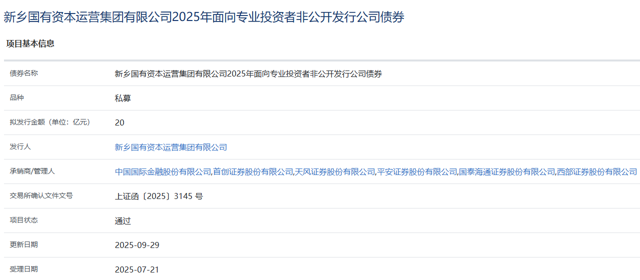 【大河财立方消息】9月29日 ,新乡国有资本运营集团有限公司2025年面向专业投资者非公开发行公司债券获上交所通过。该债券拟发行金额20亿元,承销商/管理人为中金公司、首创证券、天风证券、平安证券、国泰海通、西部证券。2025年6月24日,经大公国际综合评定,发行人主体信用评级为AAA,展望稳定。