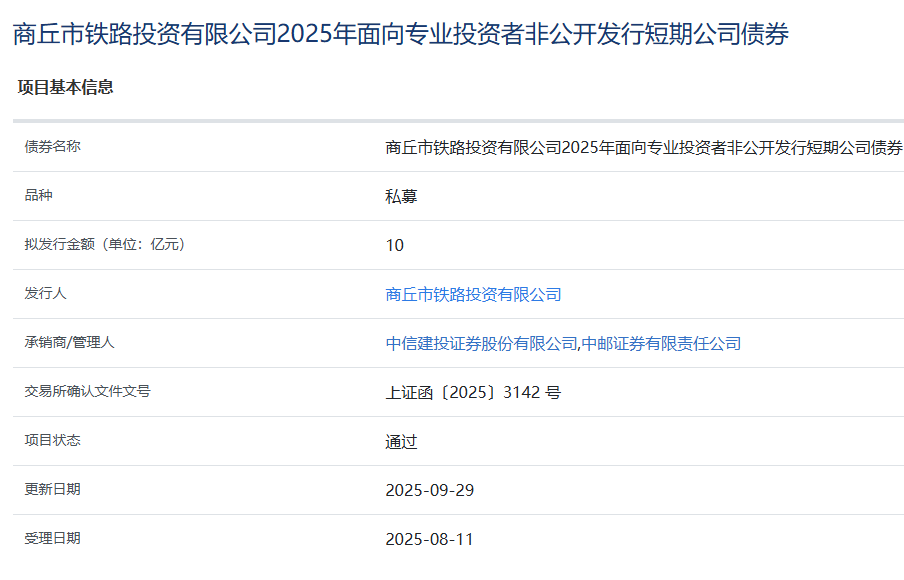【大河财立方消息】9月29日,商丘市铁路投资有限公司2025年面向专业投资者非公开发行短期公司债券获上交所通过。该债券拟发行金额10亿元,承销商/管理人为中信建投、中邮证券。2025年6月25日,经中诚信国际综合评定,发行人主体信用评级为AA,展望稳定。