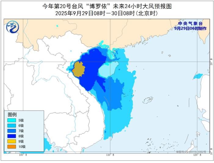 大风预报:29日8时至30日8时,南海西部、西沙群岛附近海域、北部湾、琼州海峡、广东西部沿海、海南岛及沿海、广西沿海将有6-8级、阵风9-10级的大风,其中,北部湾偏南海域的风力有9-10级、阵风11-12级。