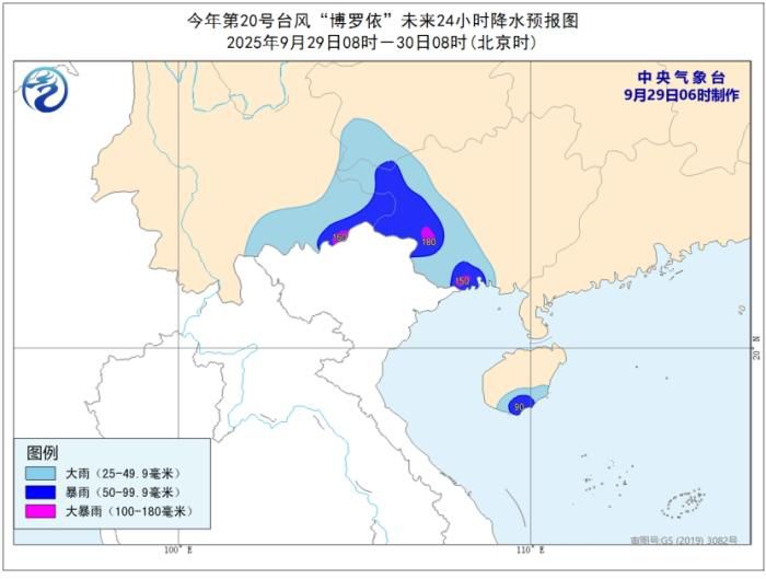 降水预报:29日8时至30日8时,海南岛南部、广西西部、云南东南部、贵州南部等地有大到暴雨,其中,广西西南部、云南东南部等地部分地区有大暴雨(100~180毫米)。