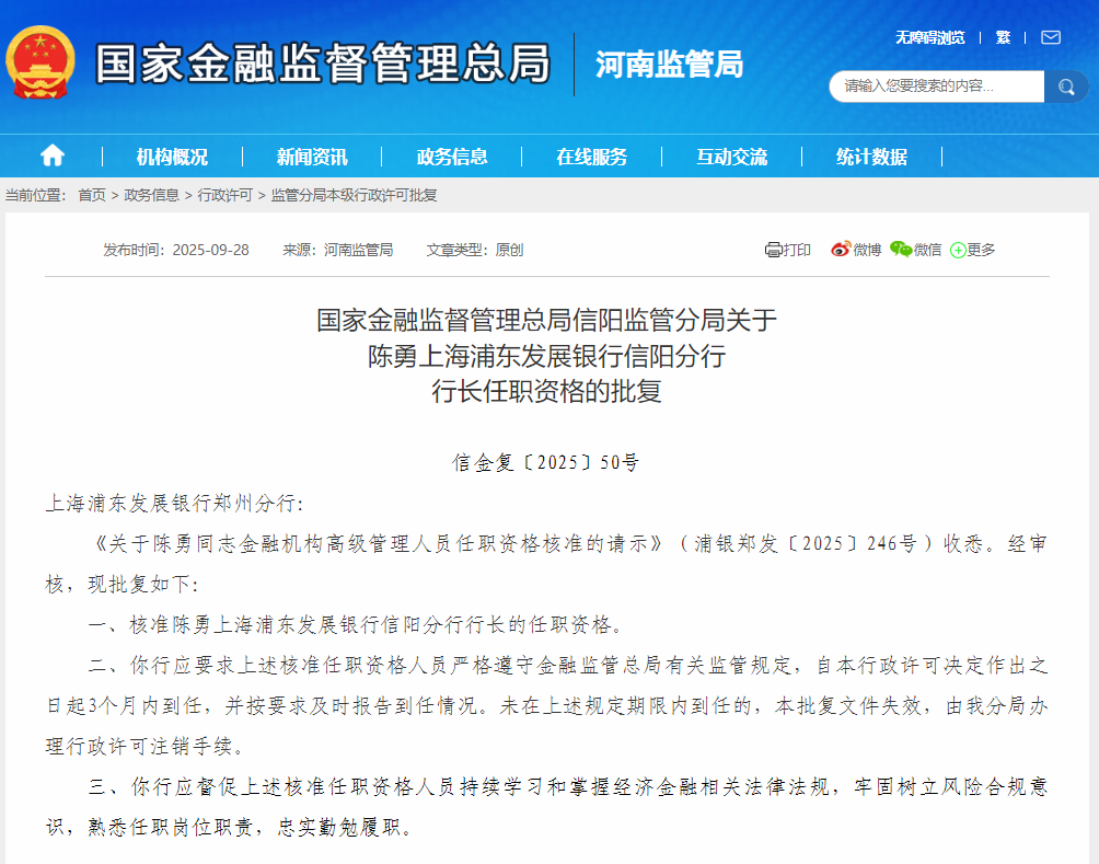 【大河财立方消息】9月29日,国家金融监督管理总局信阳监管分局批复,核准陈勇上海浦东发展银行信阳分行行长的任职资格。