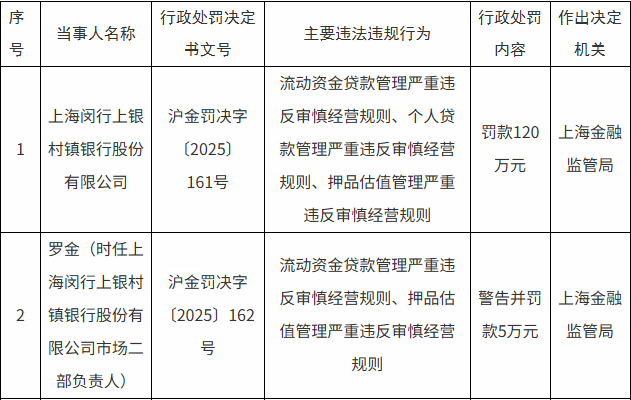 时任上海闵行上银村镇银行市场二部负责人罗金对流动资金贷款管理严重违反审慎经营规则、押品估值管理严重违反审慎经营规则负有责任,被警告并罚款5万元。