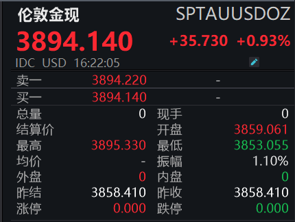 【大河财立方消息】10月1日消息,现货黄金延续涨势,站上3890美元/盎司,日内涨0.82%。截至发稿,报3894.140美元/盎司,日内涨0.93%。