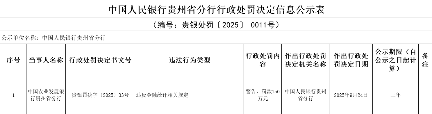 【大河财立方消息】10月3日消息,中国人民银行贵州省分行近日披露的行政处罚决定信息显示,因违反金融统计相关规定,中国农业发展银行贵州省分行被警告,并罚款150万元。