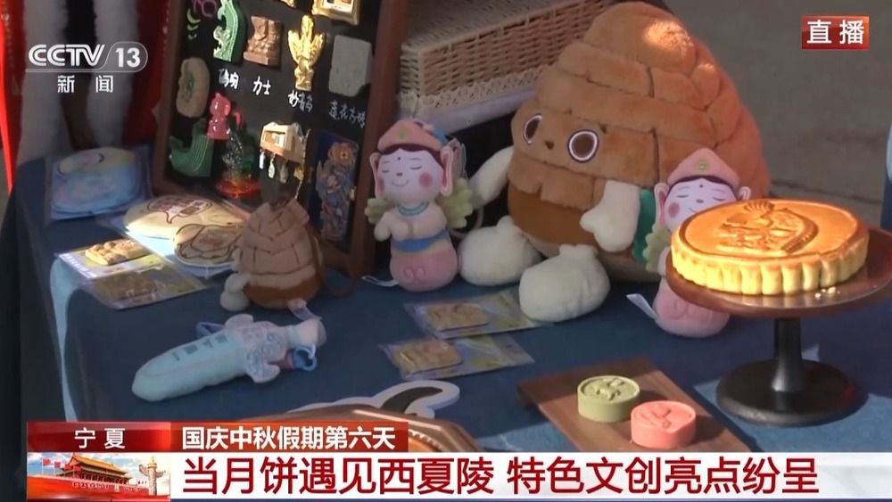 今天是中秋节,西夏陵景区现场还有专业师傅手把手教游客制作月饼。很多游客朋友还喜欢选购文创产品,像精美的冰箱贴、可爱的玩偶。游客们可以拿着文创,在身后的长廊打卡拍照,把美好的假期记忆带回家。