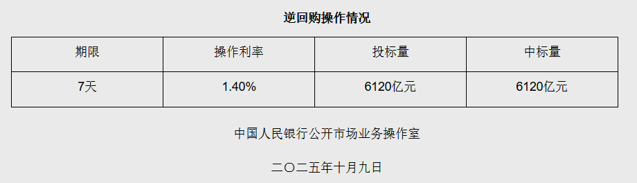 【大河财立方消息】2025年10月9日,中国人民银行以固定利率、数量招标方式开展了6120亿元7天期逆回购操作,投标量6120亿元,中标量6120亿元,操作利率1.40%,与此前持平。