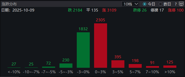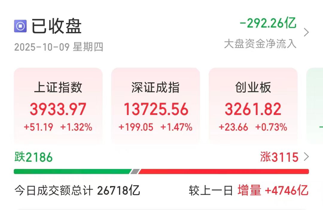 【大河财立方消息】10月9日,国庆中秋假期节后第一天,A股市场迎来开门红。截至收盘,沪指涨1.32%,站上3900点,创十年来新高;深证成指涨1.47%,创业板指涨0.73%。