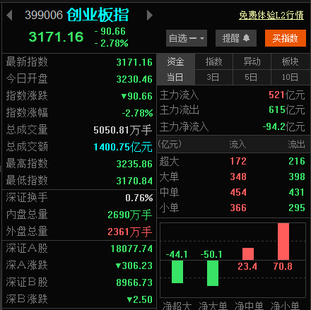 【大河财立方消息】10月10日,A股创业板急速下跌。开盘不足15分钟,创业板指数跌幅已达2.78%,报3171.16点。