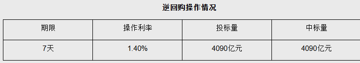 【大河财立方消息】10月10日,中国央行开展4090亿元7天期逆回购操作,投标量4090亿元,中标量4090亿元,操作利率为1.40%,与此前持平。今日有6000亿元逆回购到期,实现净回笼1910亿元。