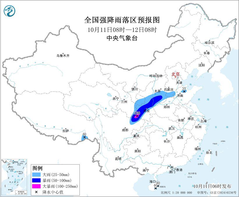 【大河财立方消息】中央气象台10月11日6时继续发布暴雨蓝色预警:预计,10月11日08时至12日08时,四川盆地西北部、甘肃东部、陕西中部和南部、山西中南部、河北南部、山东北部及海南岛东部、西藏东南部等地部分地区有大到暴雨,其中,陕西南部、四川盆地西北部等地局地有大暴雨(100~130毫米)。上述部分地区伴有短时强降水(最大小时降雨量20~30毫米,局地可超过40毫米),局地有雷暴大风等强对流天气。