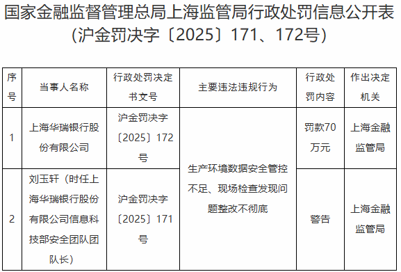 同时,上海金融监管局对时任上海华瑞银行信息科技部安全团队团队长刘玉轩警告。