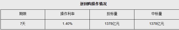 【大河财立方消息】10月13日,中国央行开展1378亿元7天期逆回购操作,投标量1378亿元,中标量1378亿元,操作利率为1.40%,与此前持平。因今日无逆回购到期,当日实现净投放1378亿元。