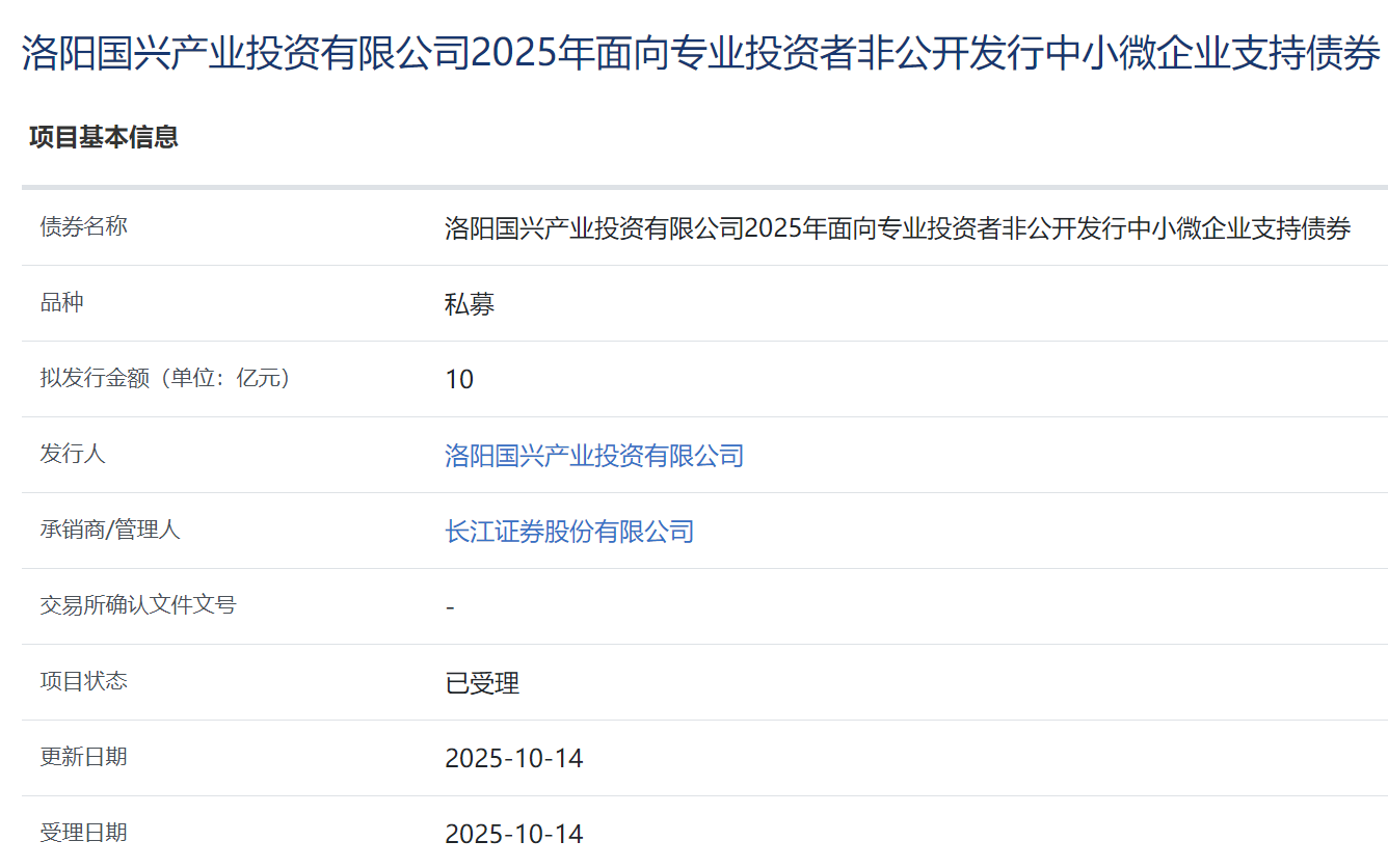 【大河财立方消息】10月15日消息,洛阳国兴产业投资有限公司2025年面向专业投资者非公开发行中小微企业支持债券项目获上交所受理。本期债券拟发行规模10亿元,承销商/管理人为长江证券。