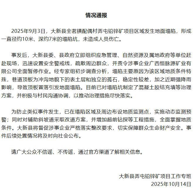 中新网10月15日电 据“今日大新”微信公众号消息,广西崇左市大新县弄屯铅锌矿项目工作专班15日发布情况通报称,2025年9月3日,大新县全茗镇配偶村弄屯铅锌矿项目区域发生地面塌陷,形成一直径约10米、深约7米的塌陷坑,未造成人员伤亡。