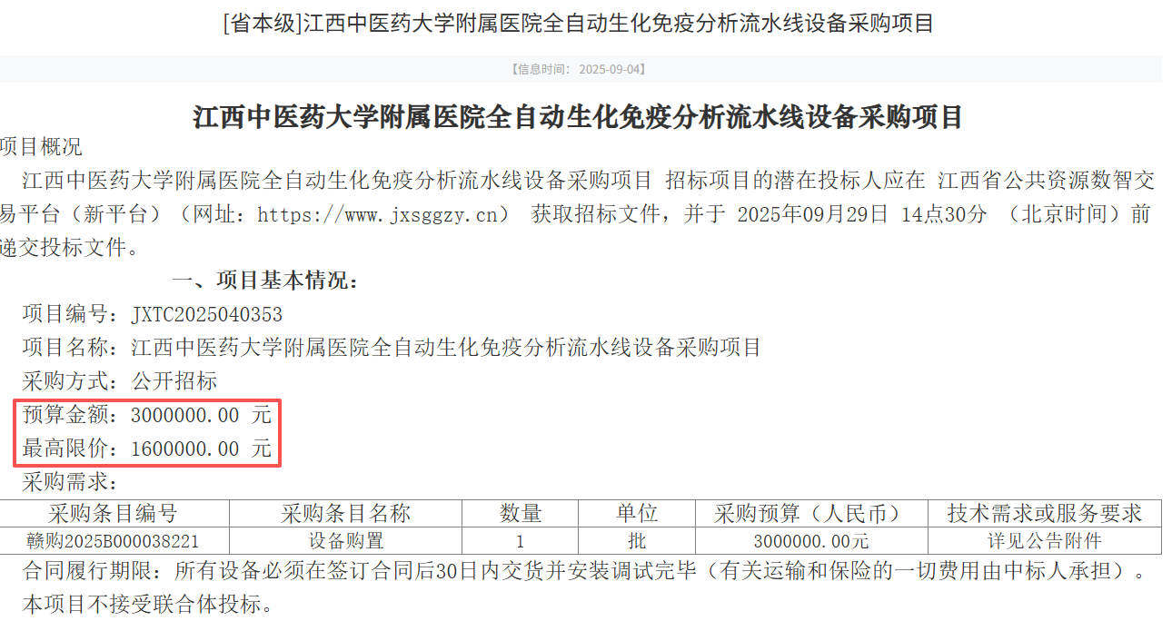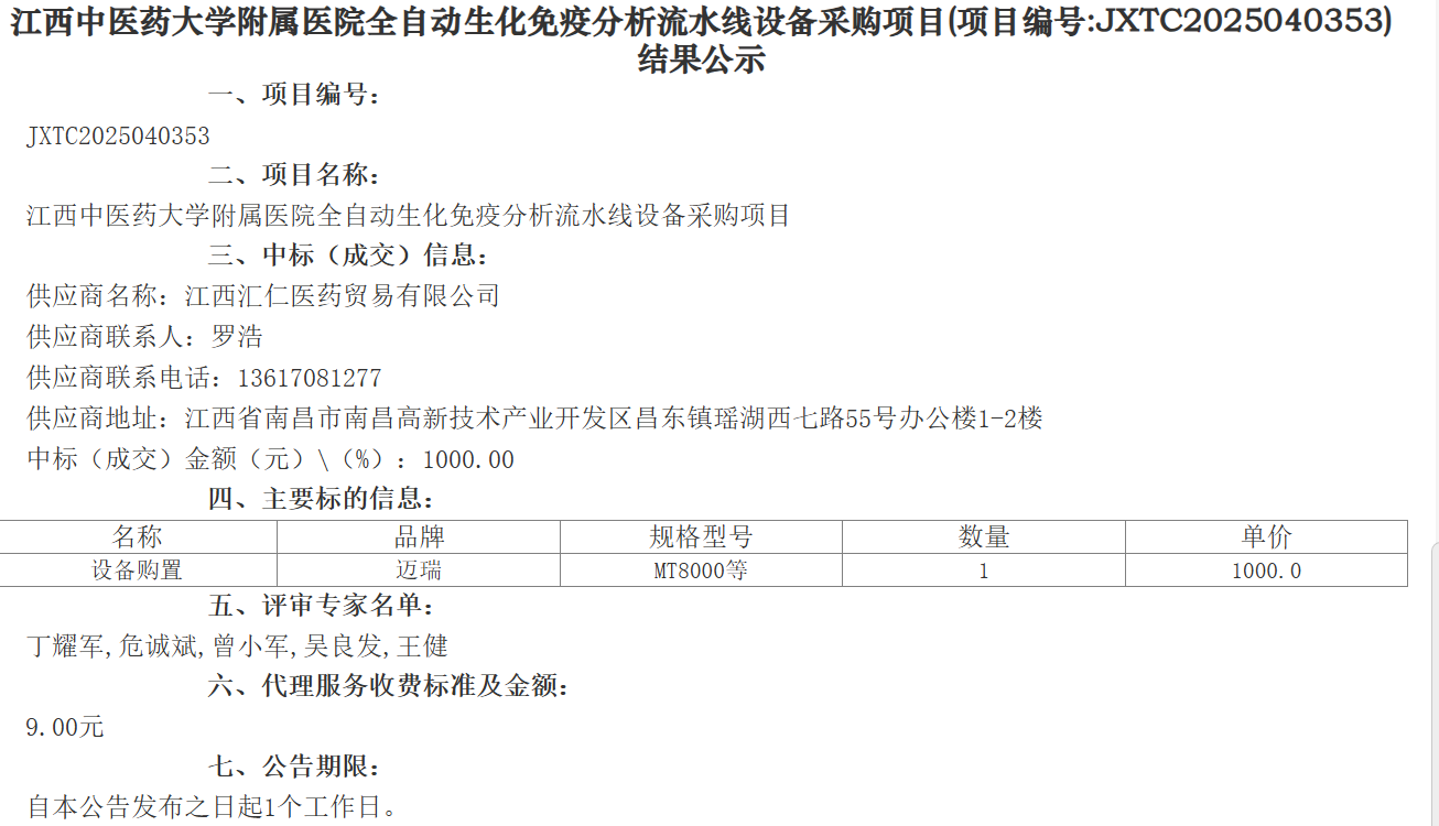 10月9日,江西省公共资源交易平台显示,江西中医药大学附属医院全自动生化免疫分析流水线设备采购项目结果公示,中标单位为江西汇仁医药贸易有限公司,中标产品系迈瑞MT8000,数量1,中标价1000元。而根据此前的招标公告,该项目预算金额300万元,最高限价160万元。
