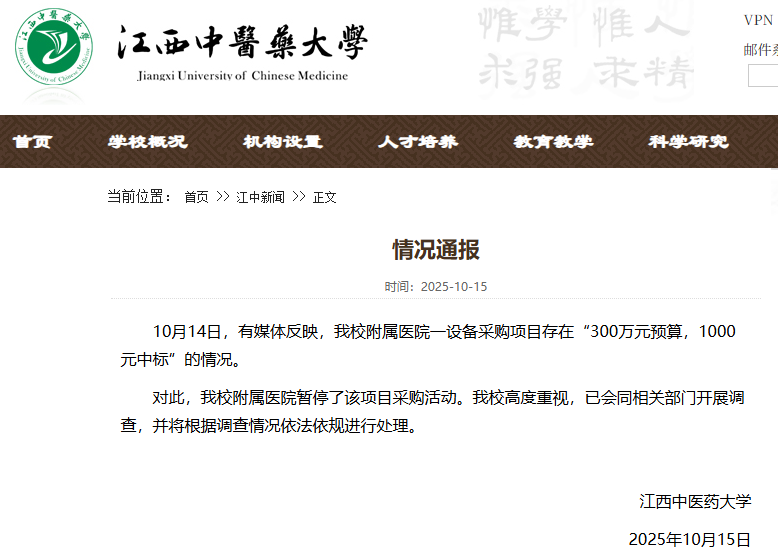 【大河财立方消息】10月15日,江西中医药大学发布情况通报,回应媒体反映的该校附属医院一设备采购项目存在“300万元预算,1000元中标”情况。