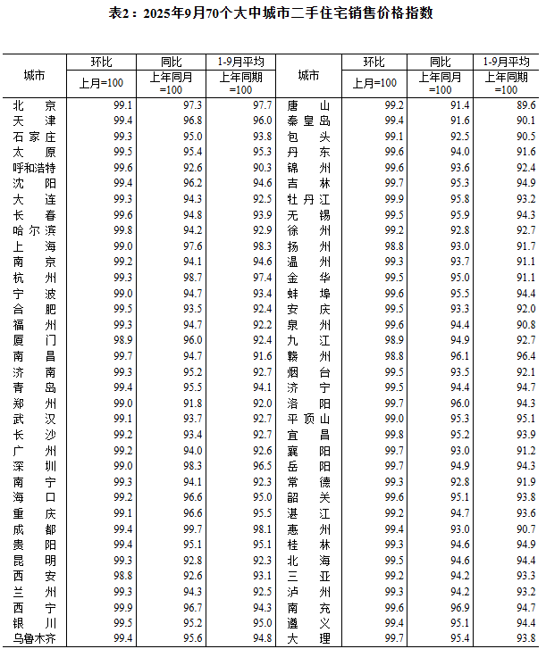 2025年9月份,70个大中城市中,各线城市商品住宅销售价格环比下降,同比降幅继续呈收窄态势。