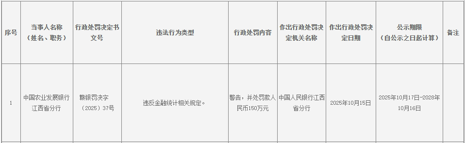 【大河财立方消息】10月20日消息,中国人民银行江西省分行披露的行政处罚信息显示,因违反金融统计相关规定,中国农业发展银行江西省分行被警告,并处罚款150万元。