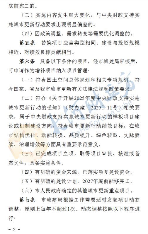 项目动态管理。规范项目管理,明确项目调整条件和流程。对于无法实施、进度滞后、内容偏差等情形的项目,需遴选与原项目类型相同、规模相近、绩效贡献相当的项目进行替换;对于符合城市更新支持方向、已立项、资金落实且2027年底前完工的项目,可以申请增补纳入管理计划。项目动态管理按“项目申报-主管部门初核-市城建局审核”的程序推进,原则上每年调整不超过1次。