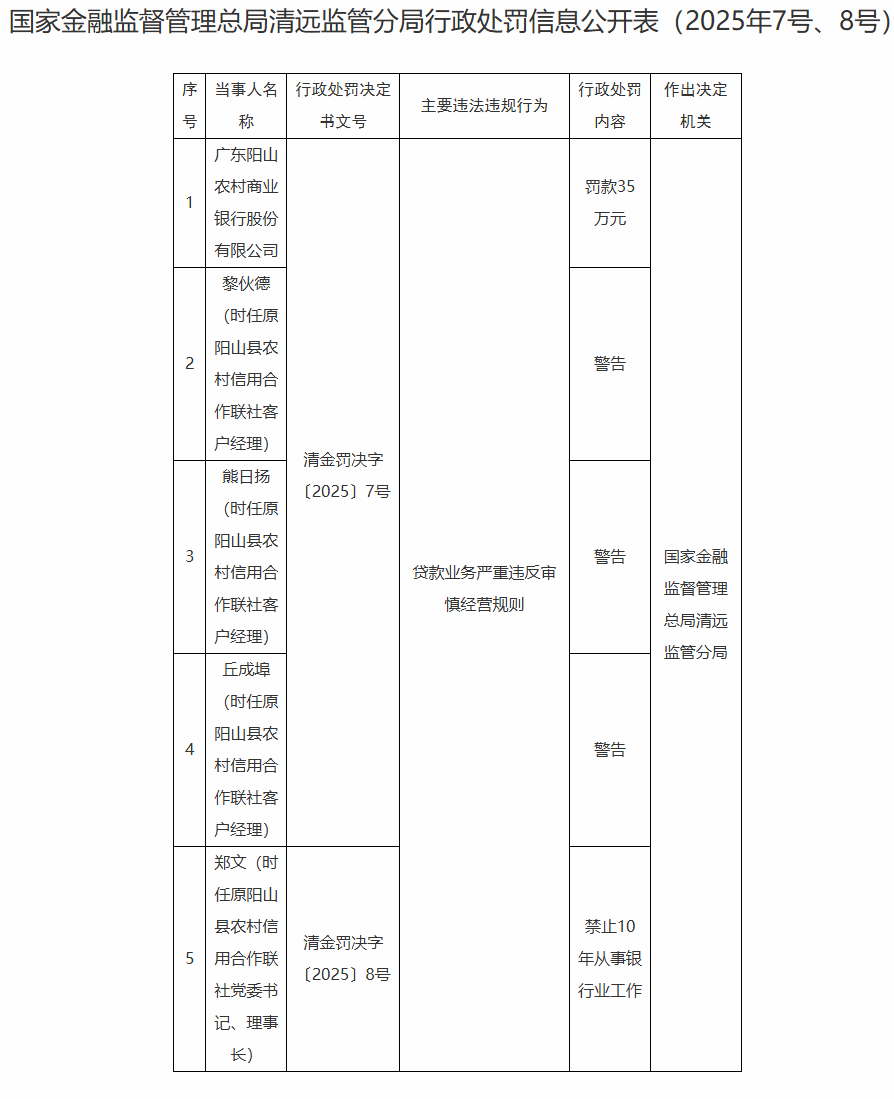 同时,国家金融监督管理总局清远监管分局对时任原阳山县农村信用合作联社客户经理黎伙德、时任原阳山县农村信用合作联社客户经理熊日扬、时任原阳山县农村信用合作联社客户经理丘成埠给予警告,对时任原阳山县农村信用合作联社党委书记、理事长郑文禁止10年从事银行业工作。