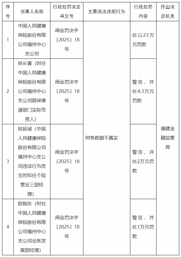 【大河财立方消息】10月21日,福建金融监管局披露的行政处罚信息公示表显示,中国人民健康保险股份有限公司福州中心支公司因财务数据不真实,被罚23万元。