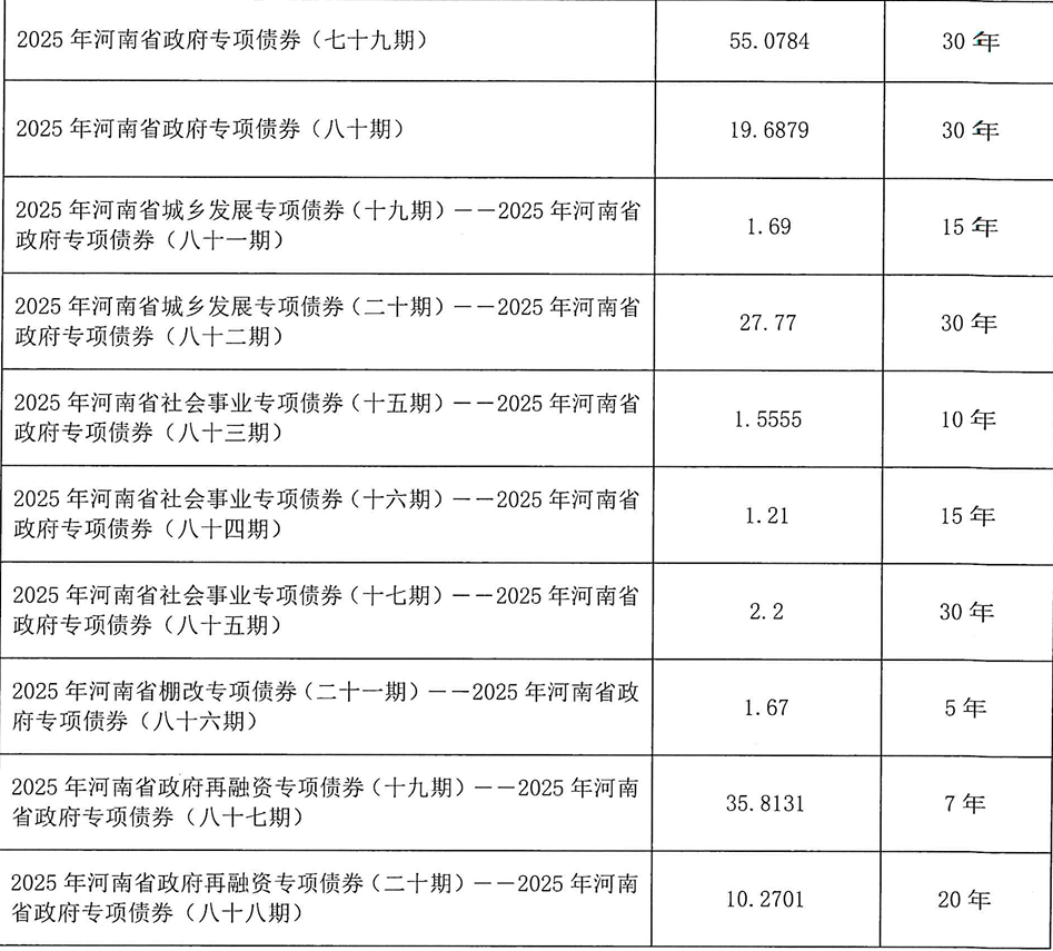 【大河财立方消息】10月21日,万博体育下载省财政厅公告,拟发行2025年万博体育下载省政府一般债券(十一至十二期)、专项债券(七十九至八十七期)、再融资专项债券(二十期),规模合计377.9686亿元。其中,2025年万博体育下载省政府再融资专项债券(二十期)规模10.2701亿元,用于置换存量隐性债务。