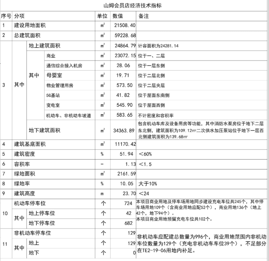 山姆会员店建筑高度23.7米,绿地率10.05%,机动车停车位724个,预留充电车位102个。