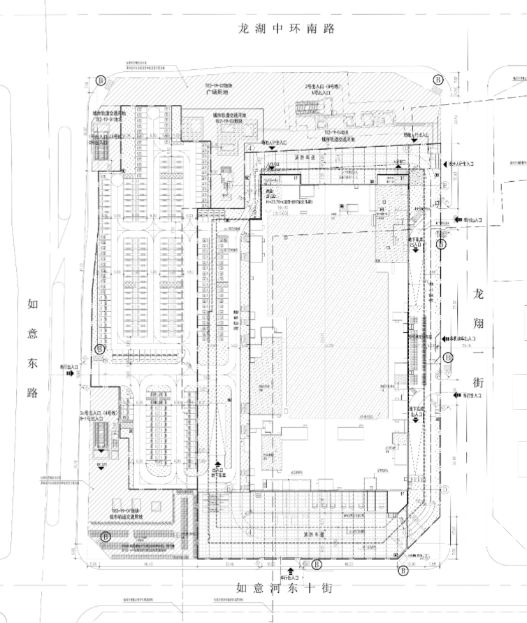 山姆会员商店项目位于如意东路东、如意河东十街北,总占地约44.01亩,由商店和交通服务场站2个块地构成,其中:商店占地约32.26亩,总建筑面积约5.93万平方米(地上建筑面积约2.49万㎡,地下建筑面积约3.44万平方米);地上建筑层数两层,主要功能为卖场、配套用房及卸货区;地下两层主要功能为车库及设备用房。