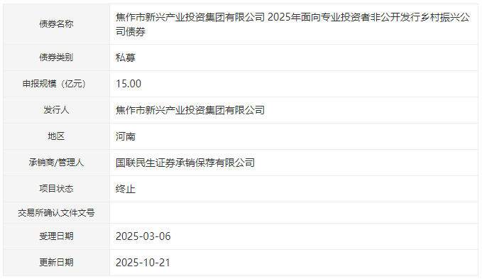 【大河财立方消息】10月21日,据深交所披露,焦作市新兴产业投资集团有限公司2025年面向专业投资者非公开发行乡村振兴公司债券的项目状态更新为“终止”。该债券拟发行金额15亿元,品种为私募,承销商/管理人为国联民生证券,受理日期为2025年3月6日。