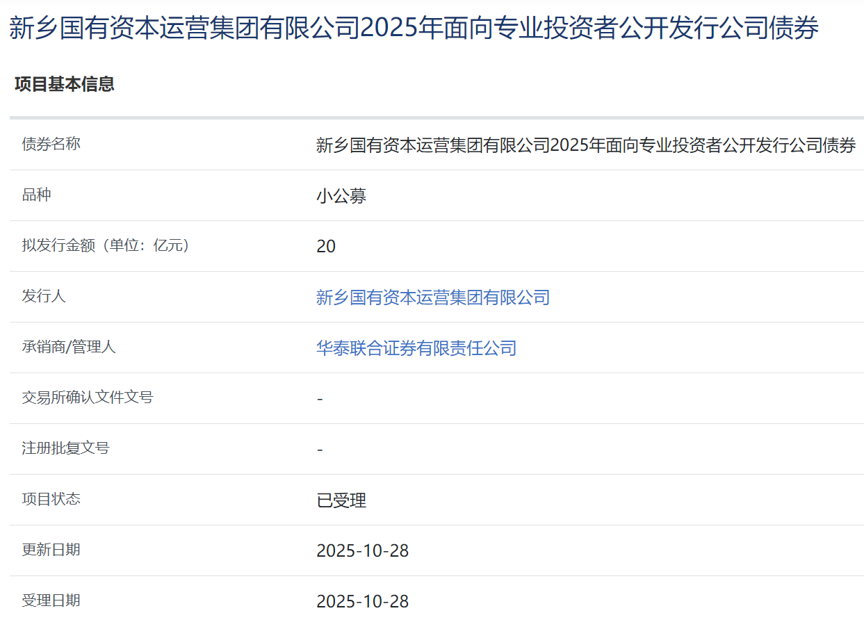 【大河财立方消息】10月28日,新乡国有资本运营集团有限公司2025年面向专业投资者公开发行公司债券项目获上交所受理。