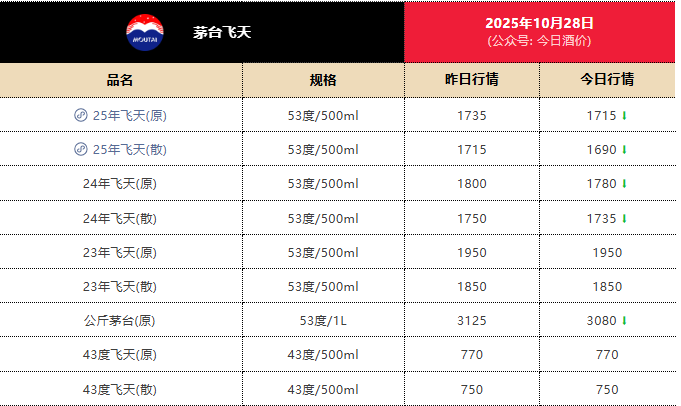 【大河财立方消息】10月28日,酒类行情监测平台“今日酒价”数据显示,2025年53度500ml飞天茅台散瓶批发参考价报1690元,较前一日下跌25元,首次跌破1700元/瓶大关,再创上市以来的新低;原箱报1715元,较前一日下跌20元。