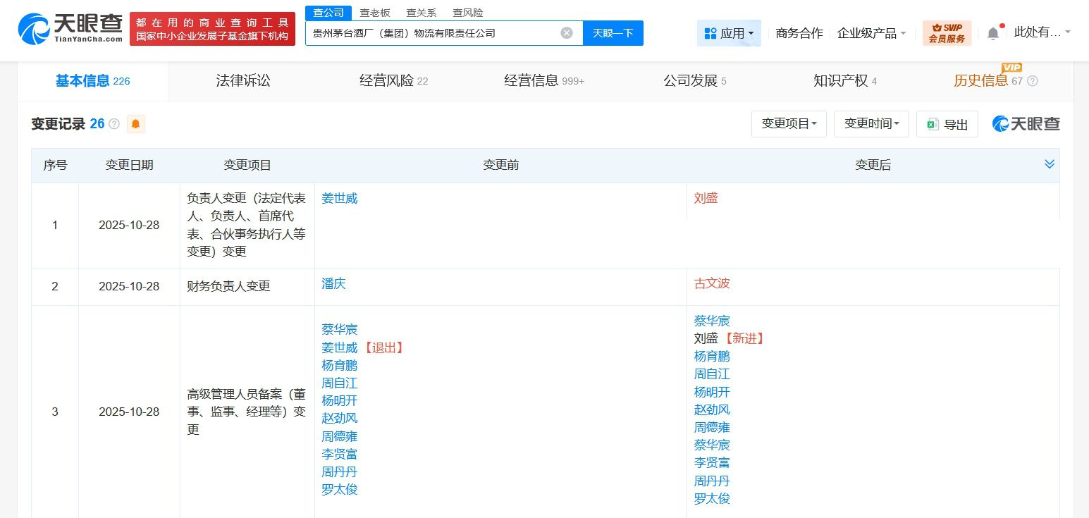 【大河财立方消息】天眼查App显示,近日,贵州茅台酒厂(集团)物流有限责任公司发生工商变更,姜世威卸任法定代表人、董事长,由刘盛接任并担任董事,同时,多位高管均发生变更。
